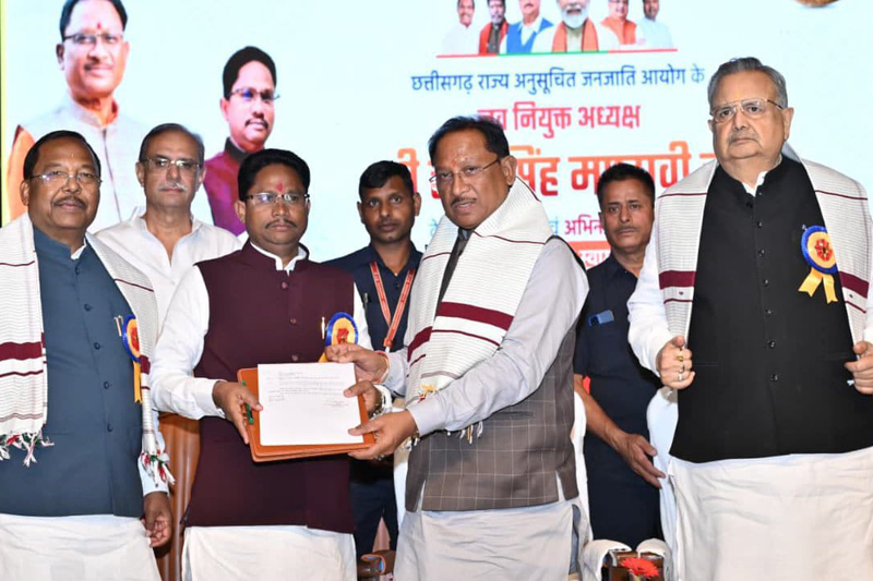 छत्तीसगढ़ राज्य अनुसूचित जनजाति आयोग के नवनियुक्त अध्यक्ष माननीय श्री रूप सिंह मंडावी जी ने शुक्रवार, 7 नवंबर, 2025 को श्यामा प्रसाद मुखर्जी उद्योग एवं व्यापार परिसर, सेक्टर-24, नवा रायपुर, छत्तीसगढ़ में पदभार ग्रहण किया। इस अवसर पर छत्तीसगढ़ के मुख्यमंत्री माननीय श्री विष्णु देव साय जी, विधानसभा अध्यक्ष माननीय डॉ. रमन सिंह जी, अजजा केबिनेट मंत्री श्री राम विचार नेताम जी, प्रदेश अध्यक्ष श्री किरण सिंह देव जी, वन मंत्री श्री केदार कश्यप जी, विधायक श्री विनायक गोयल जी सहित अनेक जनप्रतिनिधि एवं गणमान्य अतिथि उपस्थित थे |